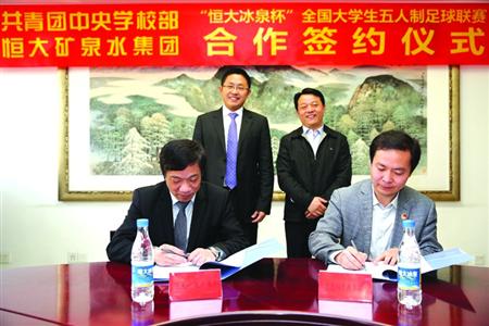 为深入贯彻落实国家足球改革有关精神,推动校园足球的广泛开展,5月4日,共青团中央学校部与恒大冰泉在北京举行签约仪式,就开展大学生“走下网络、走出宿舍、走向操场”主题群众性课外体育锻炼活动专项活动之“恒大冰泉杯”全国大学生五人制足球联赛签订战略合作备忘录,共同促进校园足球运动的推广与普及,推动校园足球文化建设和人才培养。共青团中央书记处书记傅振邦、恒大矿泉水集团董事长刘永灼等出席签约仪式。