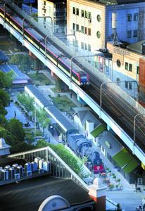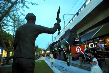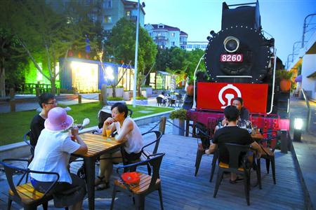 附近一家以铁路为主题的咖啡馆,店内摆放着轨道、车站、可行驶的小火车和火车调度室等铁路场景,惟妙惟肖地让顾客亲身感受着铁路人的生活。火车头休闲广场上,附近居民们无忧无虑地在广场上喝茶、聊天、品味着生活,小孩尽情地玩乐,一位少女弹起吉他唱着歌。今天的城市轨道交通不但让人们有快速、便捷的交通工具,也让人们感受到社会在变化中沉积下的文化和发展轨迹。