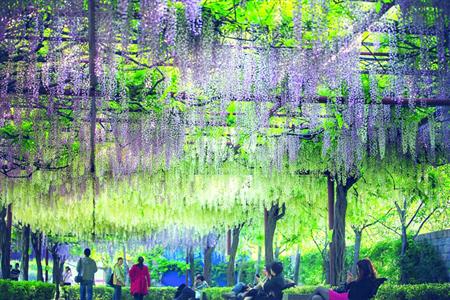 晨报讯 这两天,申城的紫藤迎来了盛花期。位于嘉定城区的紫藤园已成为观赏紫藤的热门地。昨天是工作日,记者驱车前往公园采访,没想到等空车位就等了半个小时。才1万多平方米的小小公园里,紫藤花架下人头攒动,工作日游客也达到了一两万人次,远比上海动物园、世纪公园的游客数多,甚至赶超樱花节期间顾村公园工作日的游客量。